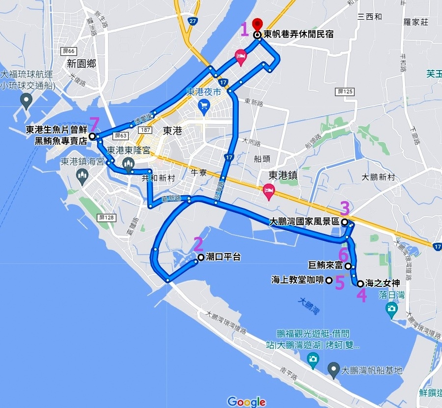 ▼ 抵達東港 先到民宿確認入住無誤後,即到大鵬灣景區遊覽。景點遊序如圖示。